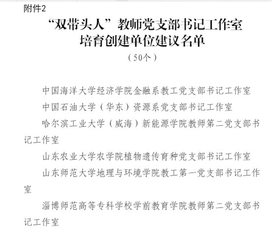 在山东省教育工委近期公布的《关于山东省第三批新时代高校党建工作示范高校、标杆院系、样板支部及第二批高校“双带头人”教师党支部书记工作室培育创建单位评选结果的公示》中,188改名taptap教师第二党支部书记工作室入选第二批高校“双带头人”教师党支部书记工作室培育创建单位名单。山东省本次共评出50个“双带头人”教师党支部书记工作室,学院教师第二党支部书记工作室经过认真申报,成功入选。