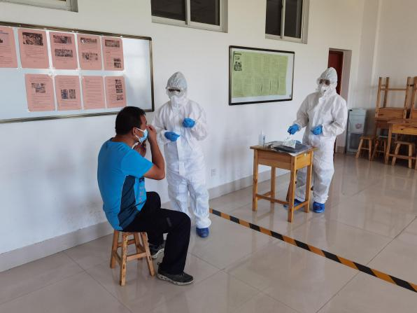 演练中,学院党员教师分成三组,分别扮演授课教师、辅导员和学生。重点演练了课堂授课场景中学生出现发热情况的应急处置流程:授课过程中某学生自觉有发热情况并伴有咳嗽、胸闷等不适症状后第一时间报告授课教师,授课教师立即要求全体学生配戴好口罩,保持安全距离原地待命,安抚好学生情绪,打开教室门窗保持通风,同时,立即联系学院辅导员。接到电话后,辅导员A立即穿着防护套装A前往教室引领体温异常学生到临时留观点由留观转诊组工作人员进行复检,做好体温异常学生的思想工作,测温后如异常,模拟上报疫情防控指挥部,及时联系定点医院转诊。辅导员B穿着防护套装A在体温异常学生离开教室后留在教室登记其他学生信息,安抚学生情绪,随后联系后勤管理处进行消毒消杀工作。