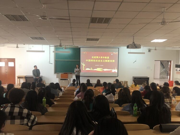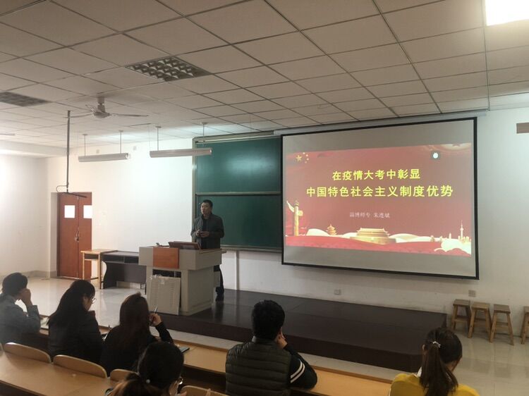 朱连斌从四个方面阐述了在疫情大考面前,我国向世界展示了中国特色社会主义制度的优势:一、彰显坚持党的集中统一领导的制度优势;二、彰显密切联系群众的制度优势;三、彰显全面依法治国的制度优势;四、彰显集中力量办大事的制度优势。朱连斌引用了抗击疫情过程中的感人事例,对比了国内外抗击疫情的不同情况,深入浅出的为大家讲述了中国作为社会主义国家,面对疫情的考验,党中央带领人民群众万众一心,取得抗击疫情胜利的必然性,总结了抗击疫情期间宝贵的中国经验,同学们在报告中感悟、沉思,为祖国母亲倍感自豪和骄傲。
