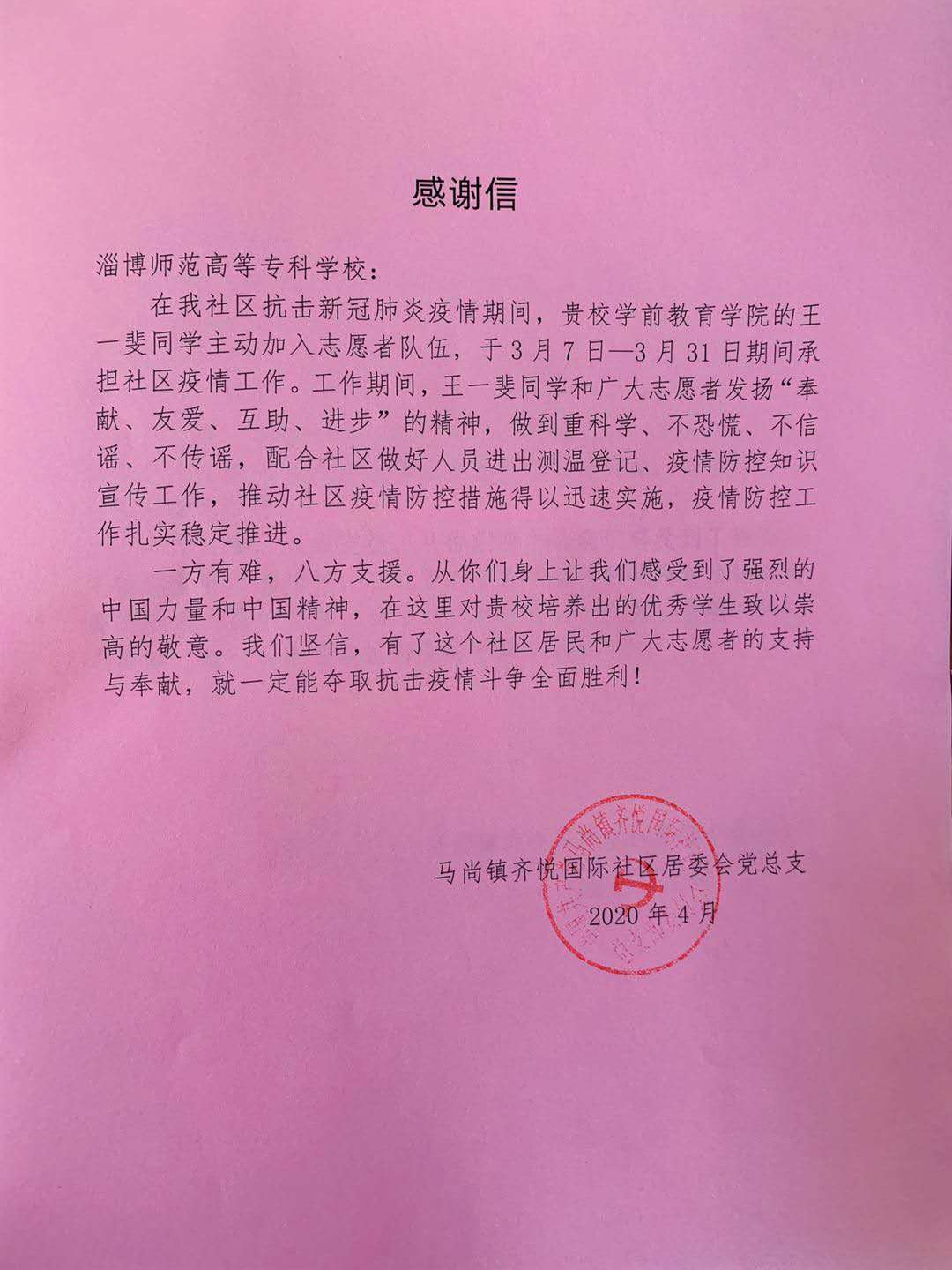 近日,我院收到一封来自淄博市张店区马尚镇齐悦国际社区居委会党总支的感谢信,信中郑重表扬了我院王一斐同学为社区疫情防控工作做出的积极贡献,并向我院表示了感谢。