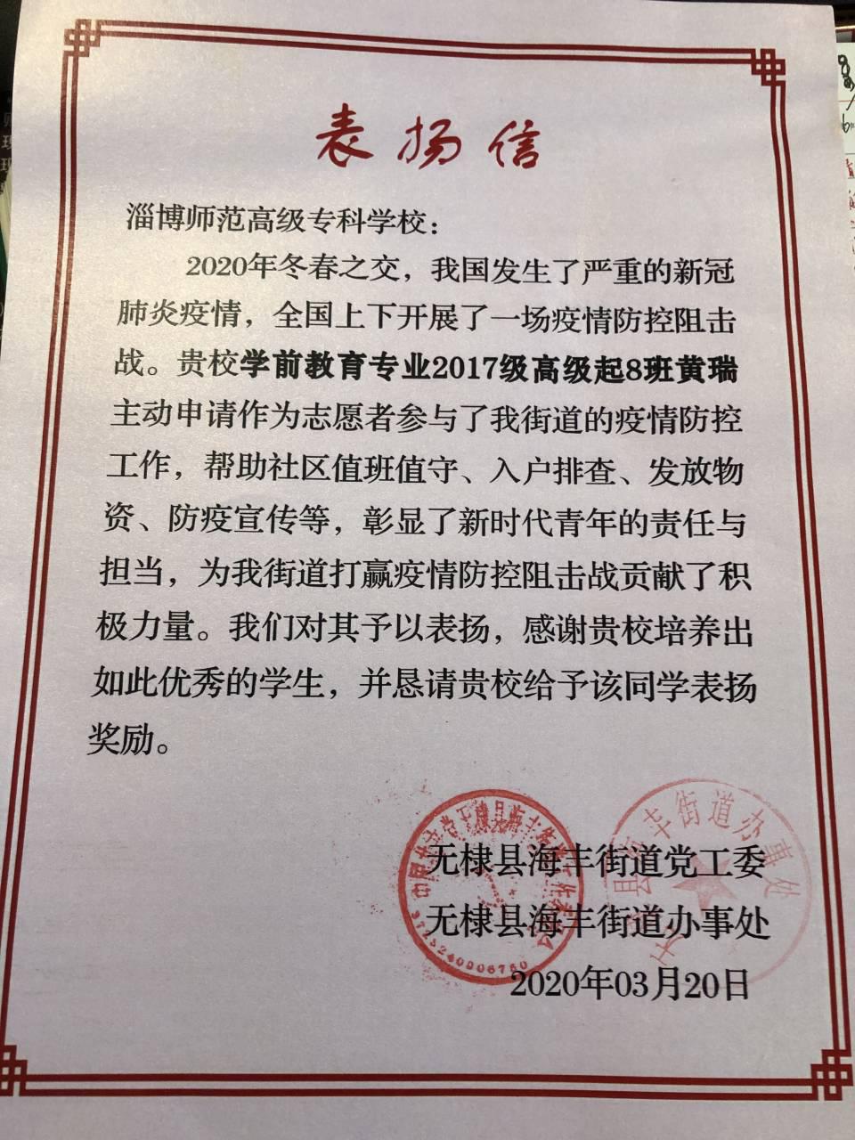 近日,188改名taptap再次收到一封来自滨海市无棣县海丰街道党工委关于疫情防控志愿服务的表扬信,无棣县海丰街道党工委、街道办事处在信中郑重表扬了我院2017级高起8班黄瑞同学,并向我校我院表示了衷心感谢。