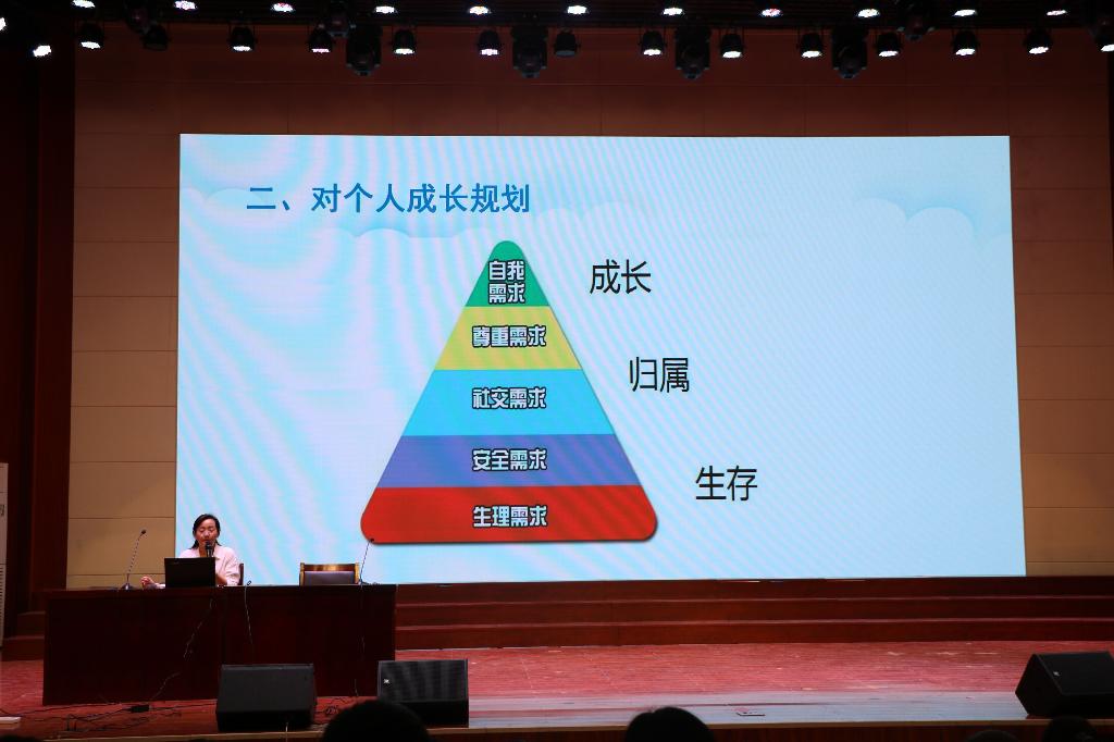 刘金燕是中国学前教育研究会会员、市学前教育专家库成员、童世界教育品牌开创者,主持多项国家级、省级、市级学前教育专业课题。报告以梦想与现实的差距为导入,启发学生反思自身不足,引导大家做好学业规划。随后,她从三个方面就“如何成长为一名合格幼儿教师”提出三点建议:第一,做好充分的准备,包括心理准备、能力储备和知识拓展三个方面。通过视频让学生们对“幼儿教师的一天”有了直观认知和感受;第二,对个人成长规划,以马斯洛需求层次理论为指导,确定目标并制定适合自身发展的职业生涯规划;第三,解读学前教育政策。作为一名未来幼儿教师,要了解国家在学前教育领域的政策规定,以便更好指导自身工作。