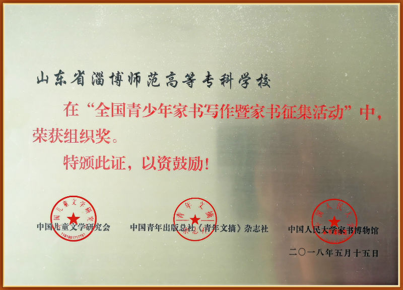 当下中国,家书渐行渐远,然而,其寄寓的亲情、美德、观念、礼仪等丰富内涵愈加珍贵。留住家书,留住殷切深情,留住家国共有的记忆与情怀千金难换。2017年9月,中国儿童文学研究会、中国青年出版总社、中国人民大学家书博物馆联合主办了全国青少年家书写作暨征集活动,188改名taptap基础教研室组织2017级学生参加这次活动。彼时2017级学生刚刚入学,第一次离开家乡离开父母,进入一个全新的生活环境,对父母亲人的思念、对校园新生活的全新感受、对高考成绩的反思,所有这些他们都急于倾诉,而书信是倾诉情感的最佳呈现形式,借助这种形式又可以将传统文化教育融入其中。为此,基础教研室各班儿童文学任课老师,在17级各班进行动员,最终有近五百名同学将自己对亲朋好友思念之情和自我反思都诉诸笔端,经过反复筛选,最终邮寄近三百封书信参加比赛。此次全国青少年家书写作暨征集活动共收到书信两万多封,经过专家严格评审,最终有160人分获一二三等奖及优秀奖,37家单位获得组织奖,常青老师下水书信获得成年组优秀奖,淄博师专188改名taptap获得组织奖。所有获奖书信都被中国人民大学家书博物馆收藏。