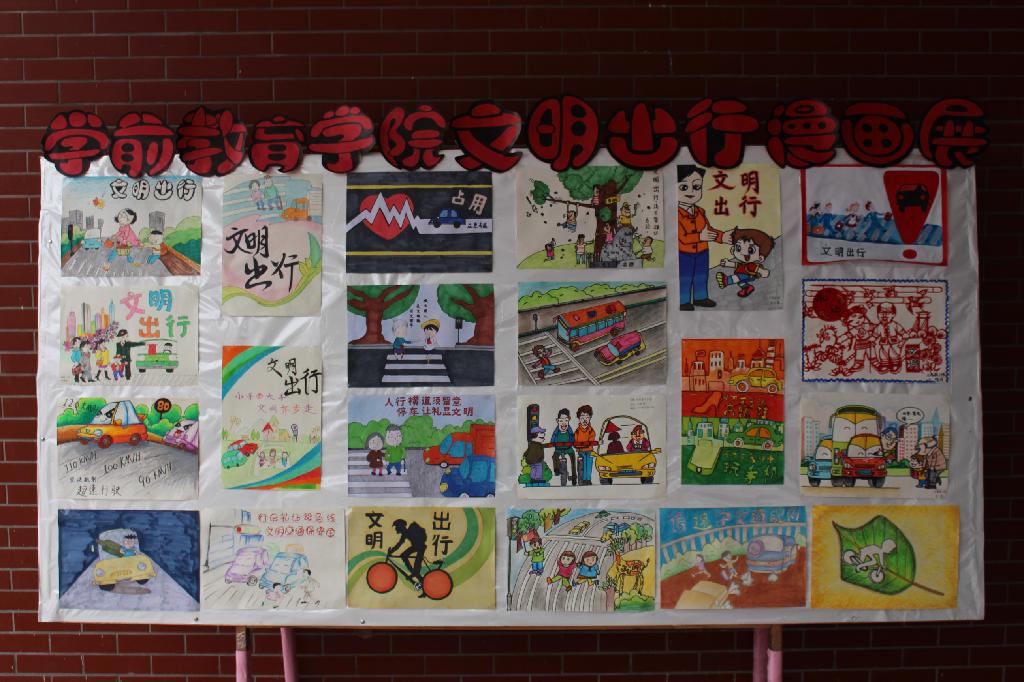 举办文明出行漫画展。结合学前教育专业实际,学院组织学生开展文明出行漫画制作活动,漫画作品栩栩如生,或者展示了当下的不文明行为,或者描绘了文明和谐的感人画面。