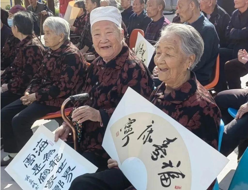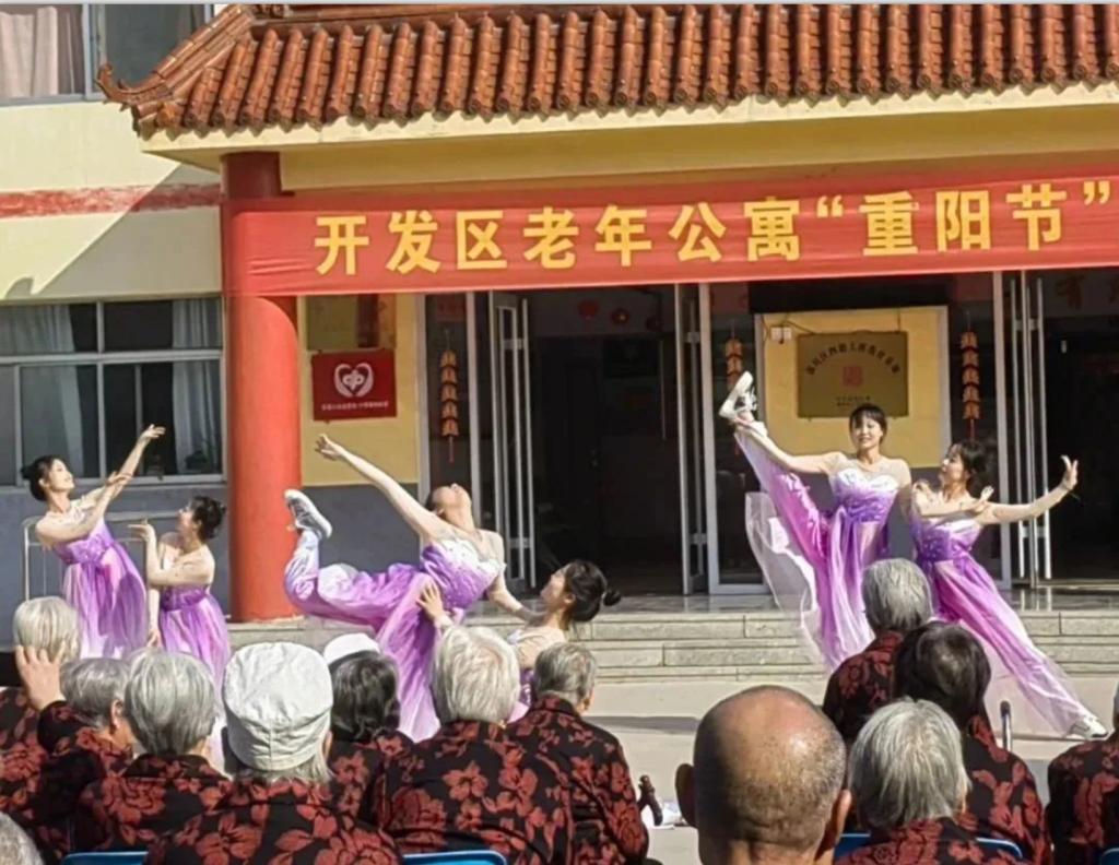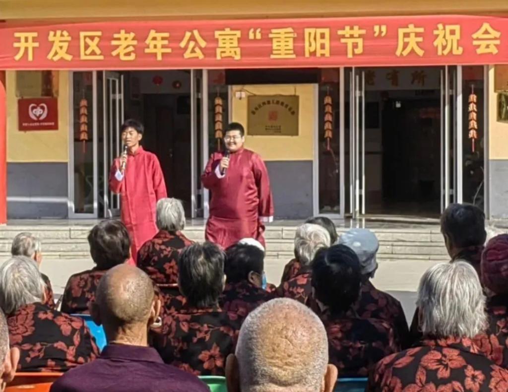 学生志愿者们为爷爷奶奶们表演精心准备的快板相声《吹牛》、舞蹈《外婆桥》、歌曲《新贵妃醉酒+天路》以及大合唱《我和我的祖国》等节目,让爷爷奶奶们沐浴在喜庆欢快的节日氛围之中。