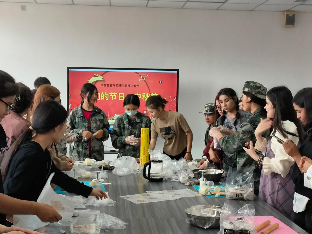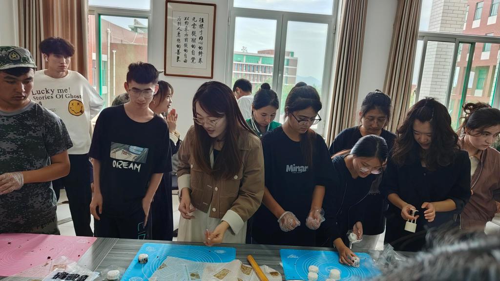 活动伊始,陈彬老师阐述了本次活动的意义,并对在场的师生送上了浓浓的节日祝福;烘焙社团学姐们向同学们示范食材准备和月饼制作方法,随后,师生们一边按照自己喜欢的口味制作冰皮月饼和蛋挞,一边互相分享家乡的中秋习俗,感受不同地区和不同民族的风俗习惯,现场一片其乐融融,充满浓浓的节日氛围。