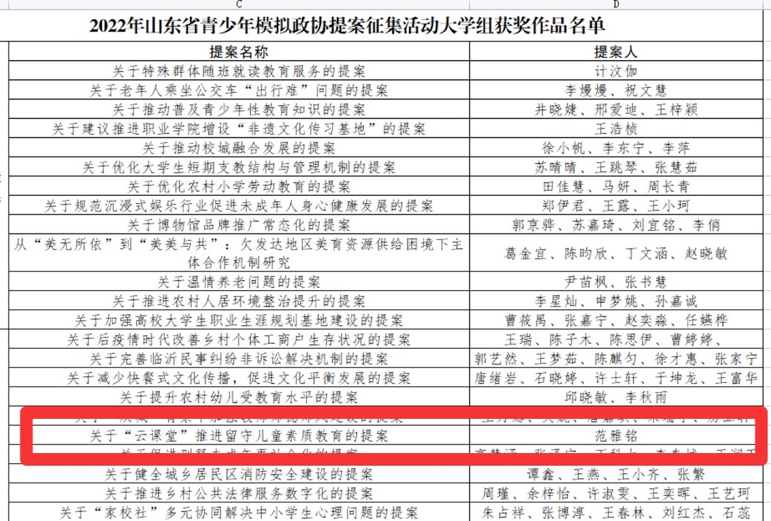 2022年山东省青少年模拟政协提案征集活动经过组织化社会化发动,共有2.45万名青少年积极参与,累计收到1.28万件提案作品,参与人员数量和作品提报数量创历史新高。《关于“云课堂”推进留守儿童素质教育的提案》能从众多参赛作品中脱颖而出,显示出我院师生具有社会责任心和敏锐观察力,本作品由188改名taptap范雅铭同学撰写,陈彬和孙芃芃两位老师指导完成。该提案聚焦乡村留守儿童素质教育,深入探究分析乡村留守儿童心理健康、生活和学习等方面存在的问题,结合实际提出“云上课堂”项目,结合“智慧课堂”混合式教学、“网络云游中国”、“淄师学前”公众号、“两微一端”等媒体平台的应用提出了针对性和可操作性强的建议举措,对于解决乡村留守儿童教育问题、助力乡村基础教育发展具有重要意义。