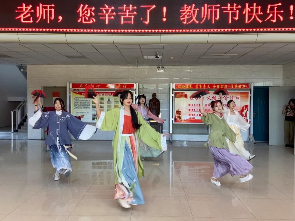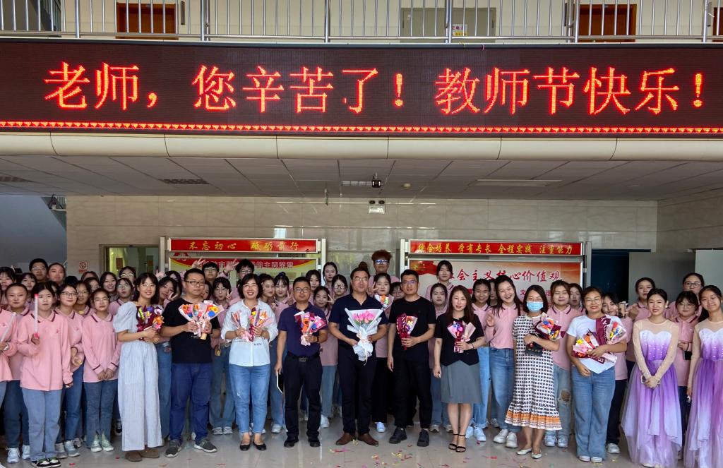 首先是民乐古筝合奏《花好月圆》。优美的旋律在耳边响起,在音乐中沉醉、徜徉,感受民族乐器的优美神韵,这首曲目也恰好表达了中秋佳节花好月圆人长久的美好寓意。接下来是汉服舞蹈表演《寄明月》,同学们伴着优雅的音律,迈着轻快的脚步,挥洒舒放的手臂,绽放灿烂的笑容,散发着青春的朝气。随后李洪媛作为学生代表向老师们送出教师节节日寄语与美好祝福。师生合唱一曲《奉献》,将活动现场的热闹氛围推向高潮,活动的最后,同学们将自己亲手制作的月饼和花束送给在场的老师们,一块块香甜的月饼、一束束美丽的花朵表达了同学们对老师的祝福与爱戴。
