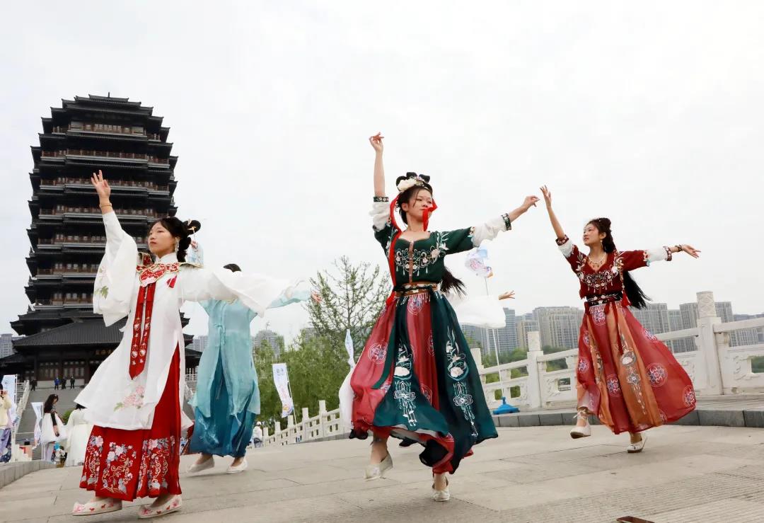 启明星社团汉服部的20多名同学在淄博齐盛湖广场海岱楼前手执团扇,伴着古典唯美的音乐,霓裳裙裾,飘飘衣袂,展示了传统服饰之美,并为现场观众带来了古风舞蹈《落霜》《遗世蒹葭》。