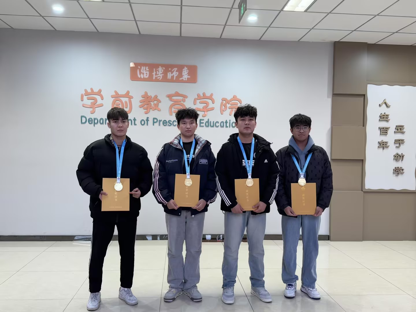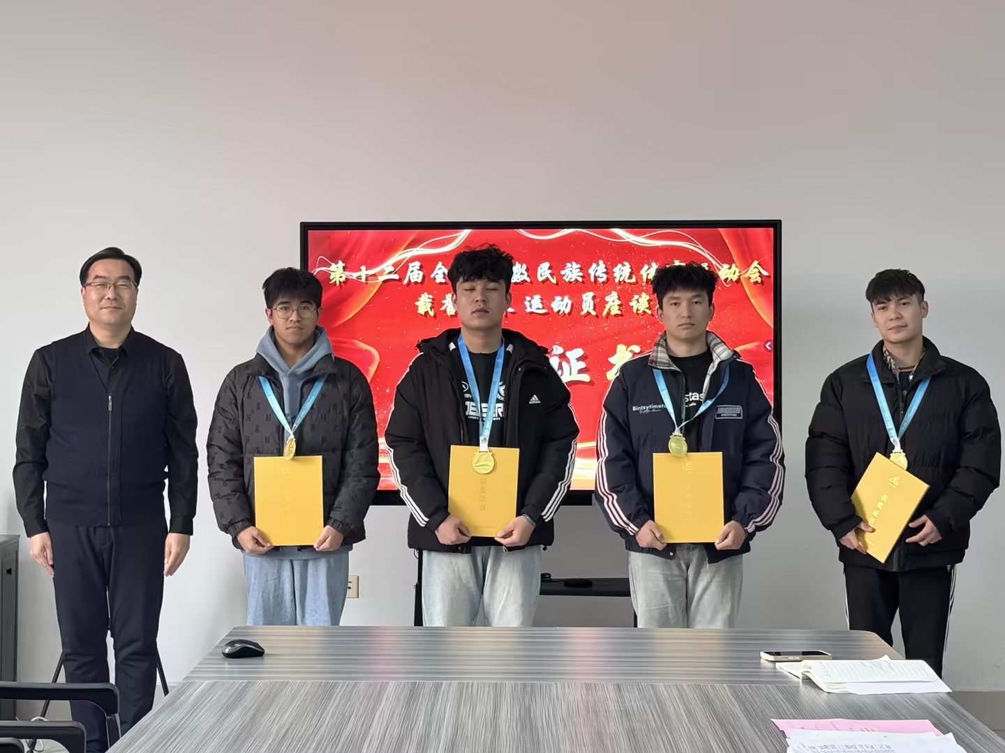 首先,由赵瑜院长和李荣昌书记分别为阿卜杜瓦哈普·库尔班、艾尔西丁·艾克拜尔、依力牙尔江·阿布来提和穆拉提·亚森四名运动员颁发获奖证书和奖牌,全体参会师生为载誉而归的学前学子报以热烈的掌声!接下来,赵瑜院长简要介绍了全国少数民族传统体育运动会的基本情况以及四名获奖运动员备赛、参赛的主要经历,肯定了同学们在全国赛事中获得一等奖的优异成绩,赞扬了运动员们团结协作、顽强拼搏的体育精神,希望将这种体育精神传承下去,在整个学院形成积极向上、追求卓越的精神风貌。李荣昌书记鼓励运动员们把体育精神运用到学习和生活中去,带动全体同学努力实现德智体美劳全面发展。最后,四名运动员就自身参赛经历和获奖心得与在场师生们进行了交流分享,大家纷纷表示,今后要在各自擅长的领域努力奋斗,为学院争光,为学校高质量发展贡献力量。