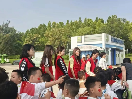 徒步过程中,志愿者们时刻关注孩子们的节奏,激发孩子继续探索的动力;当稚嫩的歌声在湖边回荡,志愿者们也会同步扬起手中的小国旗,在沉浸式互动中助力爱国情怀的种子在孩子们心中悄然萌发。