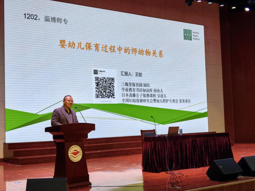 张文娟院长主持讲座,并向同学们介绍了王剑园长。王园长作为全国妇幼健康研究会婴幼儿养育照护专委会常务委员,担任中国管理科学研究院基教所0-6岁保育教育研究中心主任,多年来致力研究0-3岁婴幼儿早期发展相关理论,引进日本斋藤公子保教课程体系,创办了学前教育书店知识库,在婴幼儿养育照护方面造诣颇深。