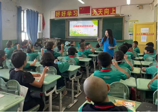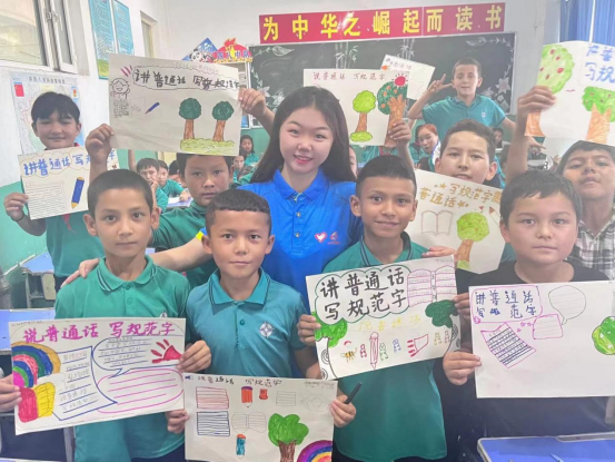 教授国家通用语言文字课程,架起民族融通桥梁。志愿者开设以“我是中国娃,爱说普通话”为主题的推普特色小课堂,课堂形式涵盖推普手抄报制作、推普手势舞、推普歌曲等,从最基础的发音开始帮助学生们解读含义,纠正发音,营造讲好普通话的浓厚氛围,并通过趣味游戏互动引导学生们大胆、自信、快乐地讲普通话,真正地将普通话应用到日常生活中。纠正学生们握笔姿势,规范书写笔画,端端正正写字,堂堂正正做人,让学生们正确认识并使用好国家通用语言文字。