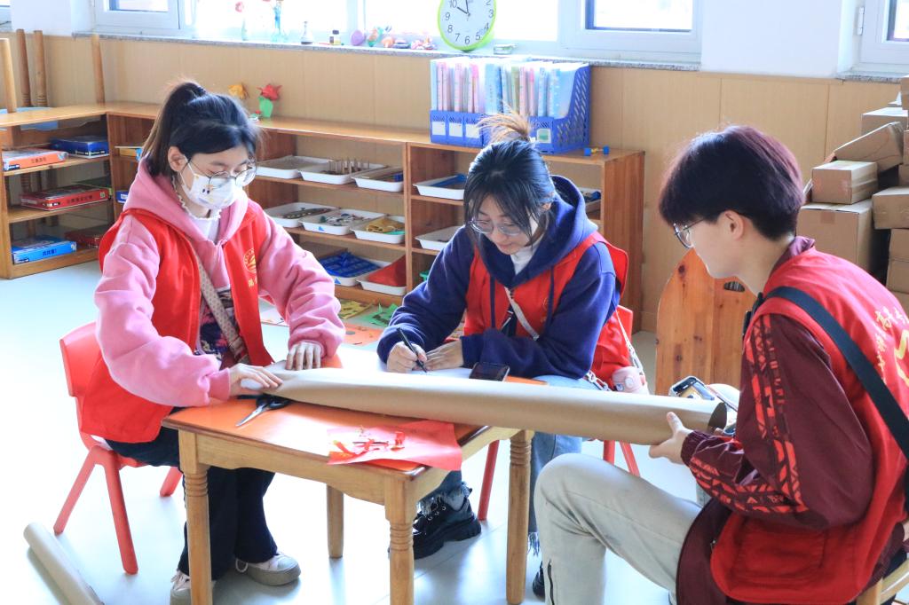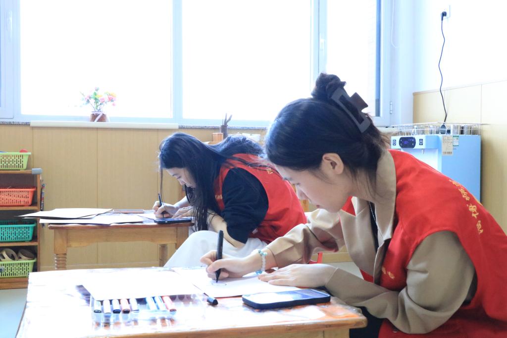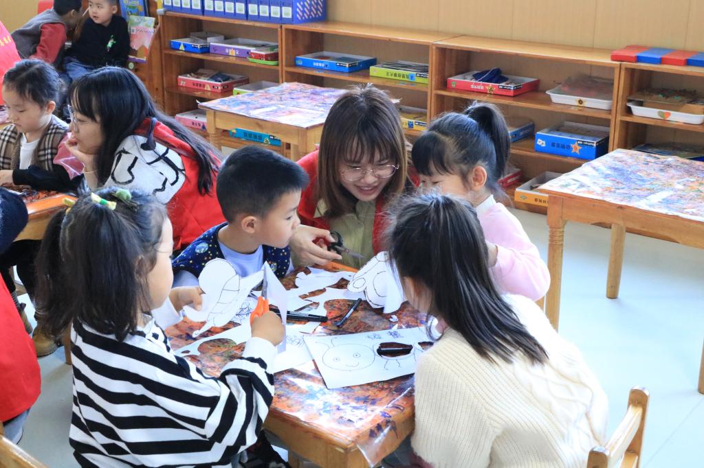 本次活动,志愿者们充分发挥学前教育专业优势去幼儿园做环创活动。为幼儿园带去水彩画、树叶粘贴画、剪纸等手工作品,布置和装饰教室和走廊的校园文化展示区。教小朋友们用太空泥、彩纸、彩线、树叶等材料做各式各样的手工艺品,用马克笔、水彩笔、蜡笔画出自己喜欢的小动物或者卡通形象,看到自己的画展示在教室里、走廊墙面上,小朋友们十分开心,争先恐后的向大家介绍自己的“杰作”。优雅温馨的幼儿园环境,不仅可以提高幼儿对美的感受,引导幼儿探索的兴趣,还能更好的激发孩子们的想象力。