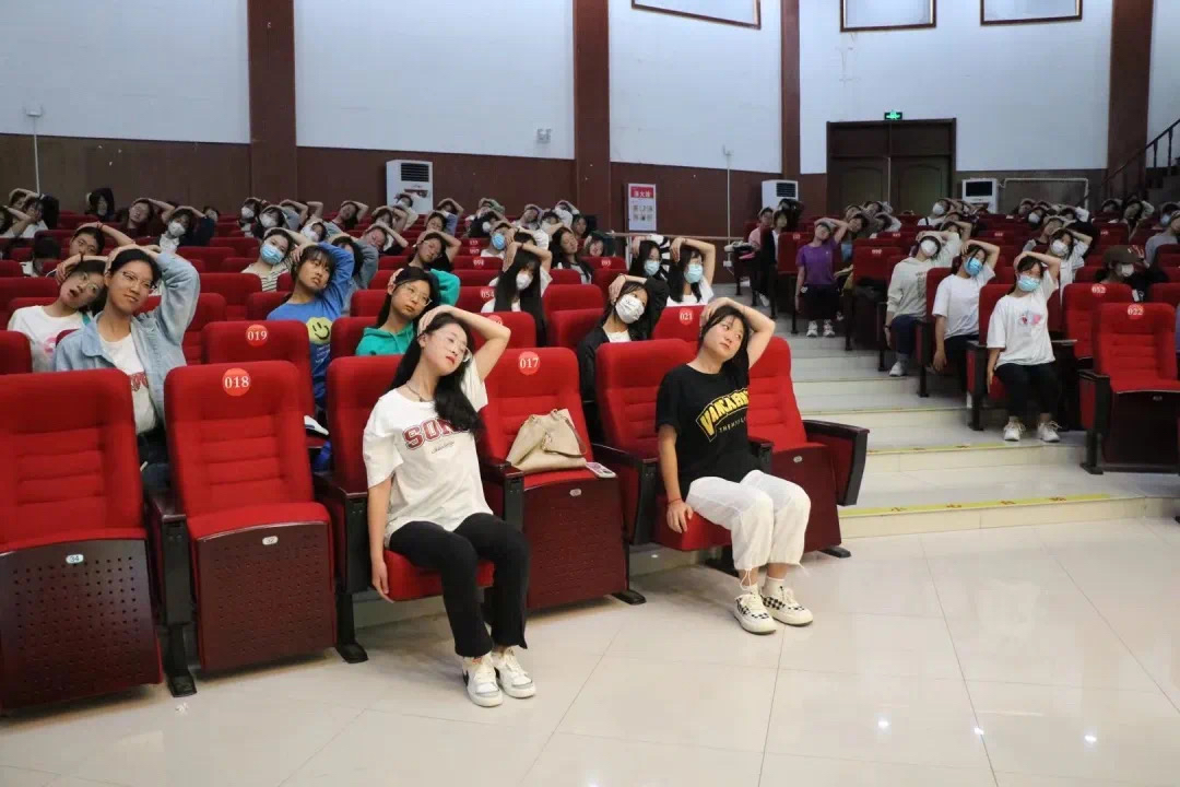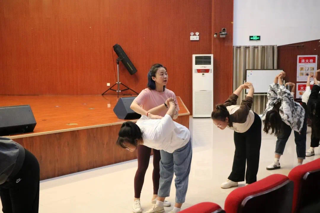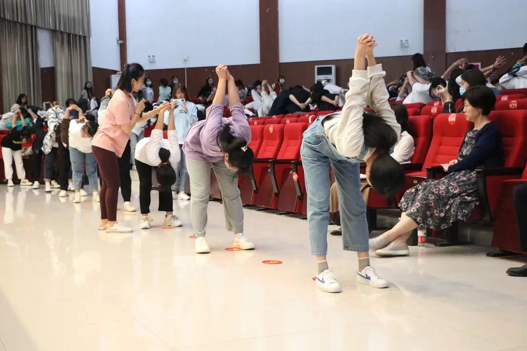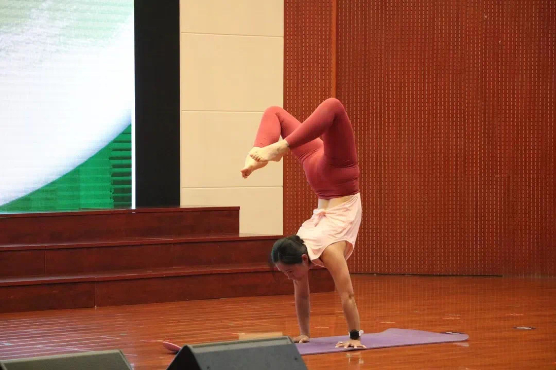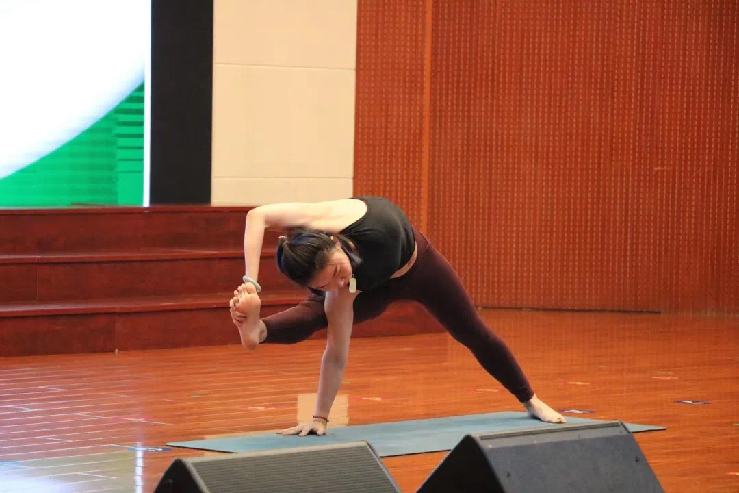 瑜伽指导老师先从简单的动作教起,之后难度逐渐增加。现场师生跟随着指导老师的节奏,轻轻地举起双手,配合着均匀的呼吸,将身心和意识融为一个和谐的整体,在指导老师的带领下尽展瑜伽风采。