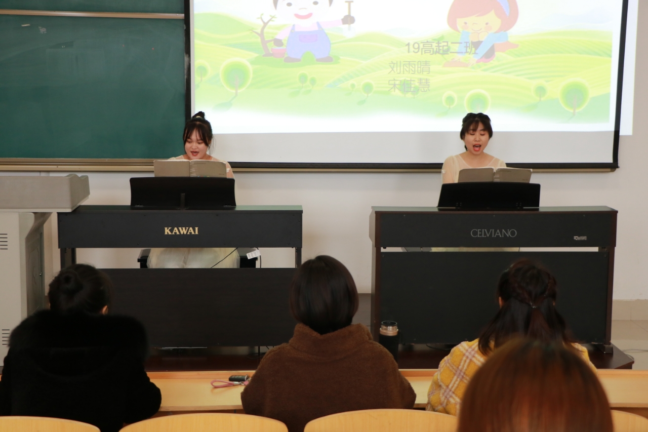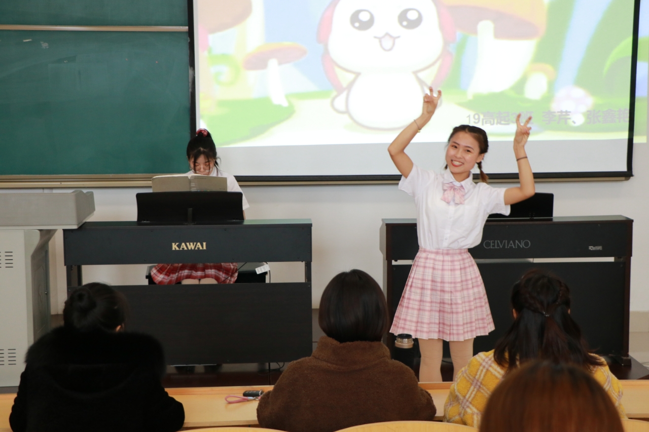 展演活动在2019级高起二班刘雨晴、宋佳慧弹唱的《金孔雀轻轻跳》《爱护小树苗》美妙的旋律和歌声中拉开了帷幕,紧接着《我是快乐的小蜗牛》《小燕子》《爸爸本领大》《猴子学样》《太阳小鸟夸奖我》《春雨沙沙》等40余首经典的儿童歌曲,被同学们精湛的钢琴演奏和动听的歌喉演绎的淋漓尽致。大家耳熟能详的儿歌从同学们的指间流出,悠扬动人的旋律,沁人心脾。