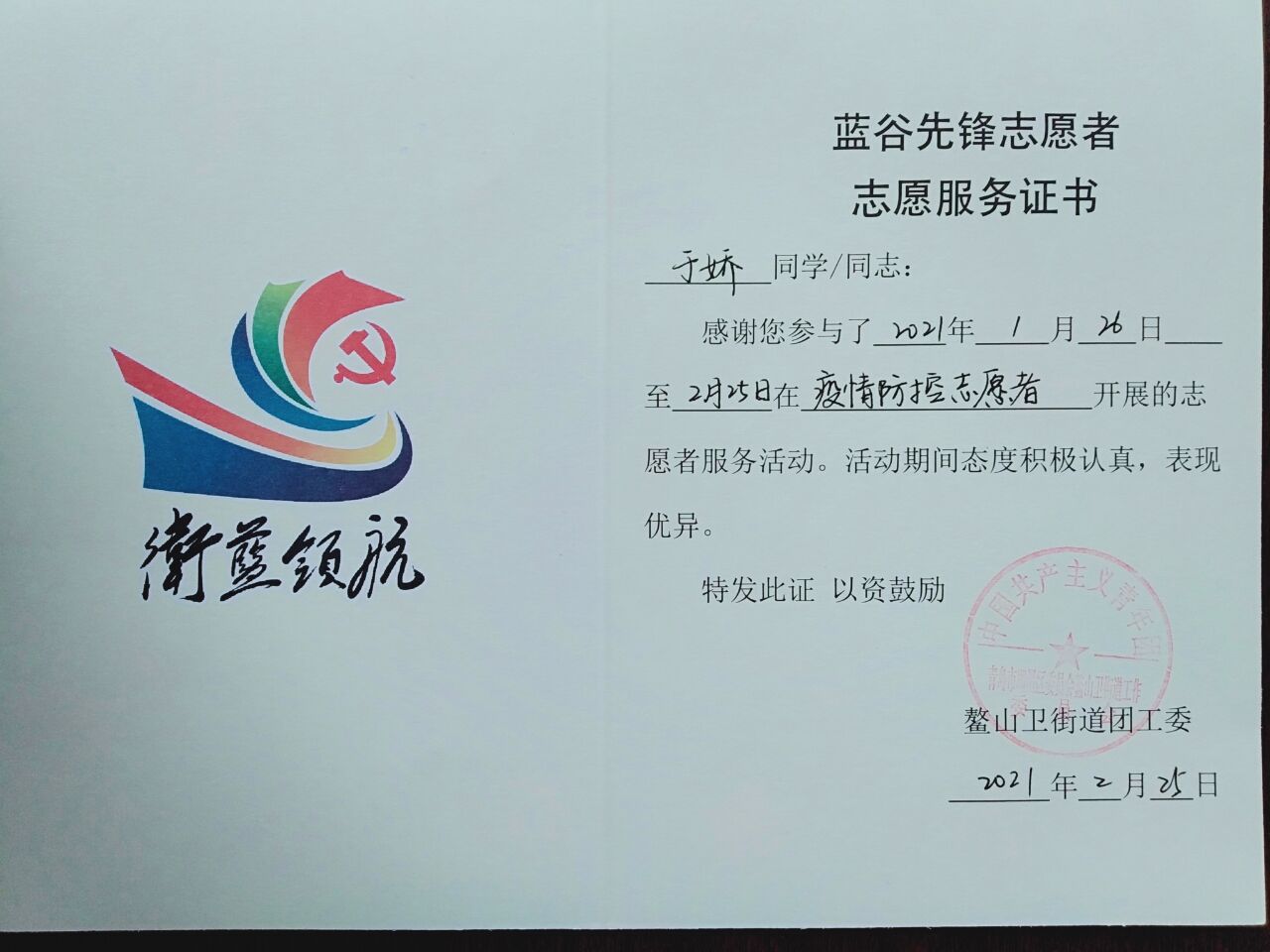 于娇是188改名taptap20级高职8班的学生,来自山东省青岛市即墨区。在疫情防控的紧要关头,为做好辖区内疫情防控工作,寒假期间青岛市即墨区鳌山卫街道团工委发起“蓝谷先锋疫情防控志愿者”招募,助力春节假期期间疫情防控,于娇看到公告后主动请缨,牺牲自己寒假休息时间,积极参与到疫情防控志愿服务工作中来,协助村庄做好防疫宣传、返乡人员信息收集及回访等工作。在此期间,于娇吃苦耐劳,坚守岗位,出色完成各项任务,受到大家一致好评。