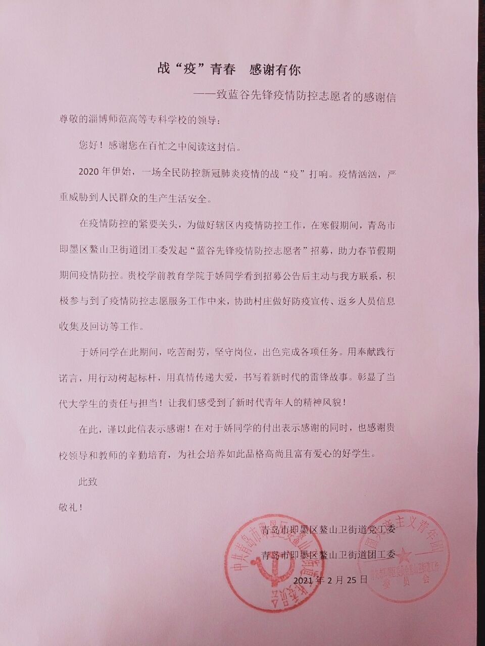近日,我院收到一封来自青岛市即墨区鳌山卫街道团工委关于疫情防控工作的表扬信。信中郑重表扬了我院于娇同学为当地疫情防控工作做出的积极贡献,并向我院表示了感谢。