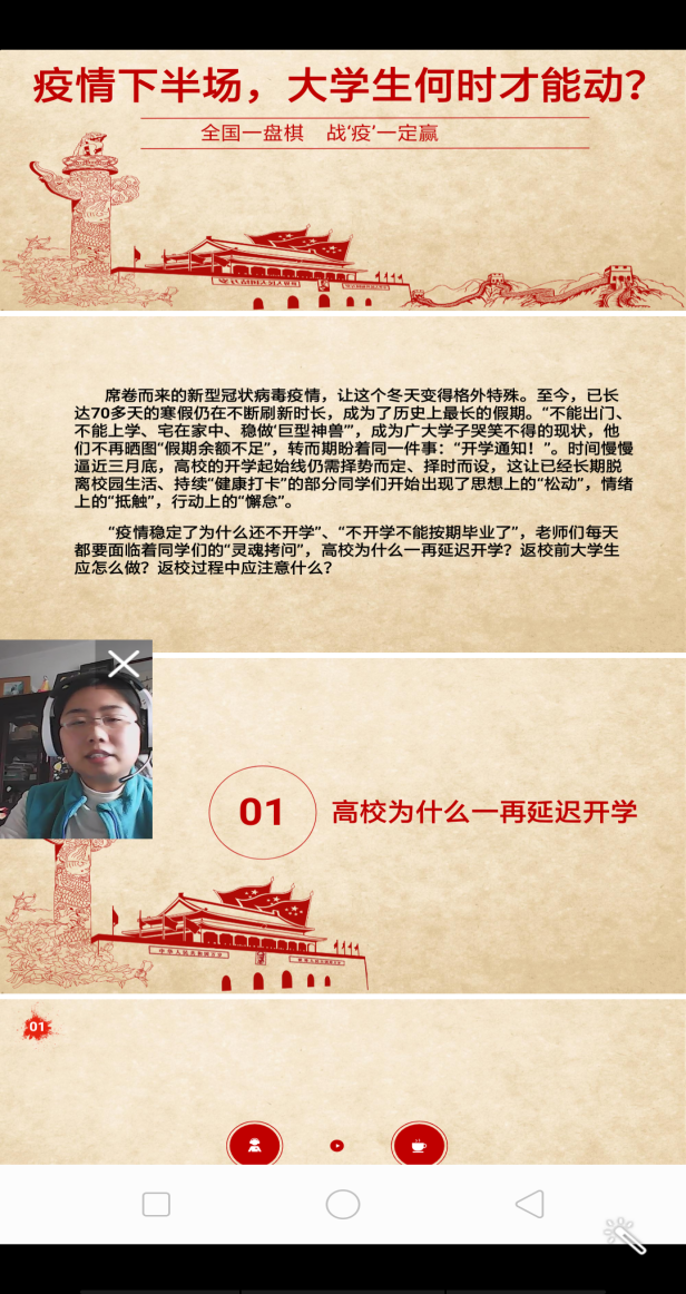 宋老师主要从“高校为什么一再延迟开学”、“返校前大学生应该怎么做”、“返校过程中应该注意什么”三方面进行讲述。通过展现详实的PPT材料,她指出当下形势依然严峻,应理性思考、统一认识、守好底线,告诫学生要配合防控,严守返校底线,居家期间严格落实“停课不停学”,坚守学生本职,告别假期综合症,回归平衡状态。如若返校,一定要做好个人防护,提高个人安全卫生意识,加强个人健康管理,主动配合学校检查登记。最后,在决胜疫情阻击战的关键时刻,请同学们耐住性子,将这一特殊期转化为自我提升的黄金期。