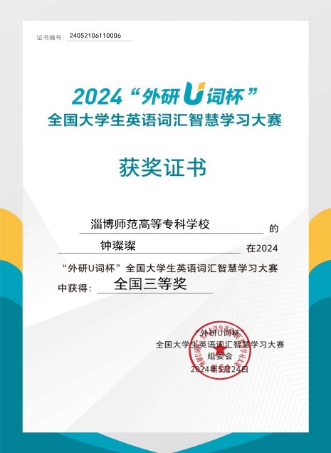“外教社·词达人杯”与“外研U词杯”全国大学生英语词汇能力大赛,不仅是学子们展现外语词汇能力的绚丽舞台,更是大学生们汇聚一堂,交流词汇学习心得的友谊桥梁。这两大赛事极大地激发了同学们的学习热情与积极性,使他们在参与中不断提升自己的英语词汇储备量;此外,这两项赛事均考察了英语思政词汇,我院学生的积极参与有助于大学生深入学习习近平新时代中国特色社会主义思想,弘扬中华优秀传统文化,进一步引导广大青年学生将爱党爱国的深厚情怀融入到英语学习的各个层面。