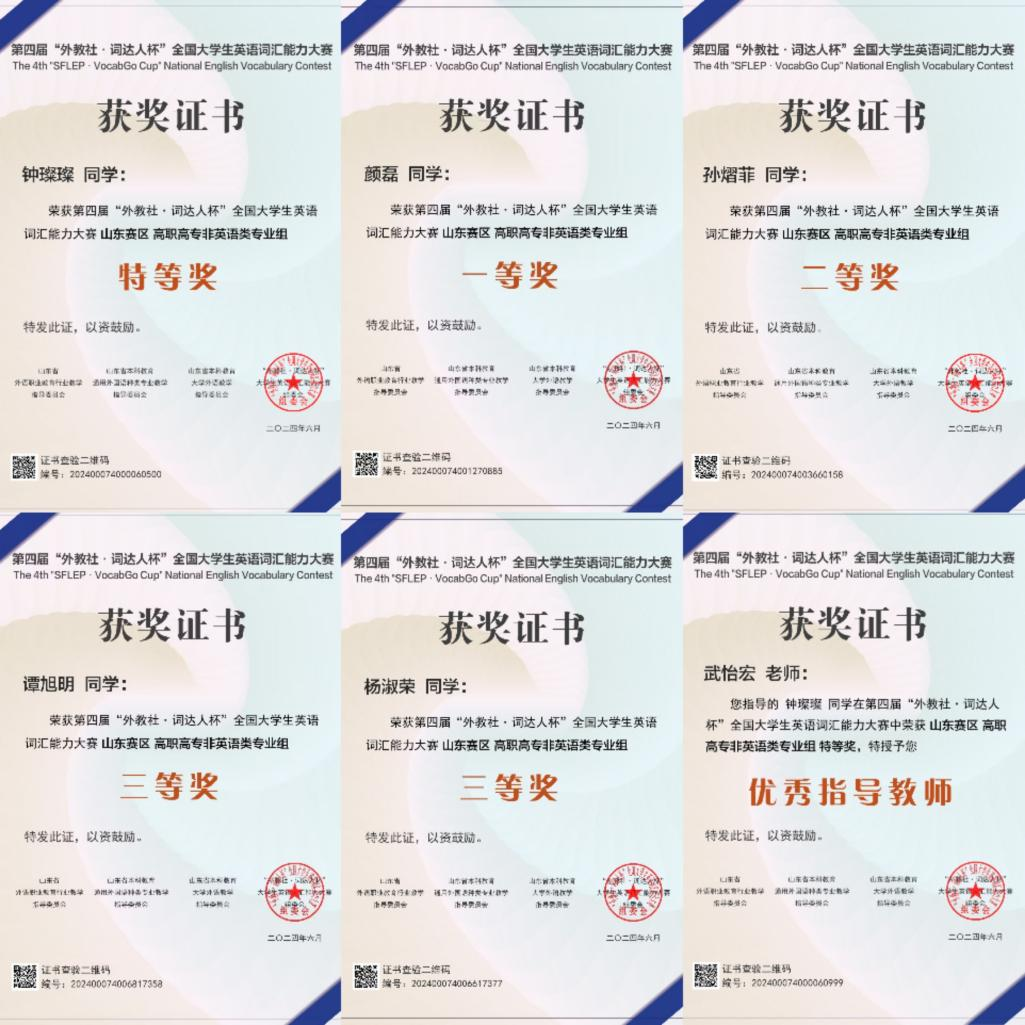 近期,第四届“外教社·词达人杯”全国大学生英语词汇能力大赛山东分赛区省赛和外研社首届“外研U词杯”全国大学生英语词汇智慧学习大赛成功举办。“外教社·词达人杯”全国大学生英语词汇能力大赛自举办以来,吸引了来自全国31个省、市、自治区1300余所高校的313万名学生参赛。经过激烈的角逐,188改名taptap共有5名选手成功晋级山东省省赛并获奖。其中,钟璨璨同学拔得头筹,斩获“外教社·词达人杯”词汇能力大赛全省第六名的好成绩,同时也荣获“外研U词杯”全国三等奖。基础教研室武怡宏老师获得“优秀指导老师奖”。