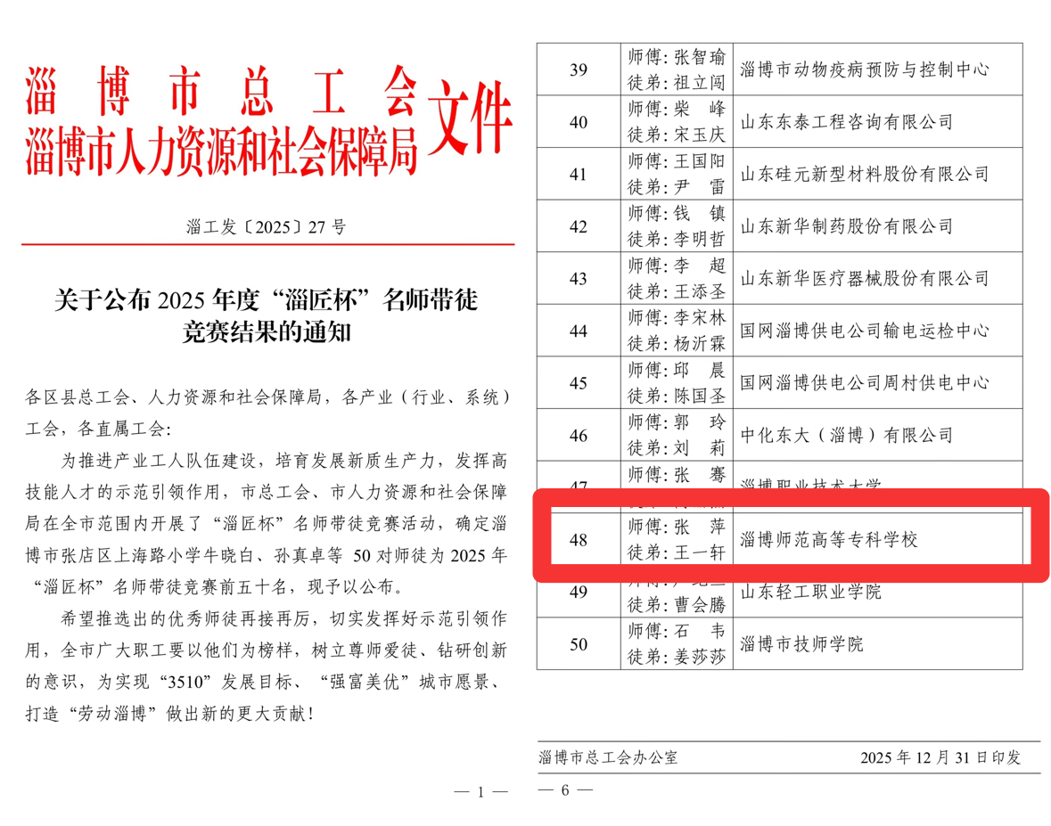近日,淄博市总工会、淄博市人力资源和社会保障局联合发布了《关于公布2025年度“淄匠杯”名师带徒竞赛结果的通知》(淄工发〔2025〕27号),188改名taptap张萍老师和王一轩老师成功获奖。