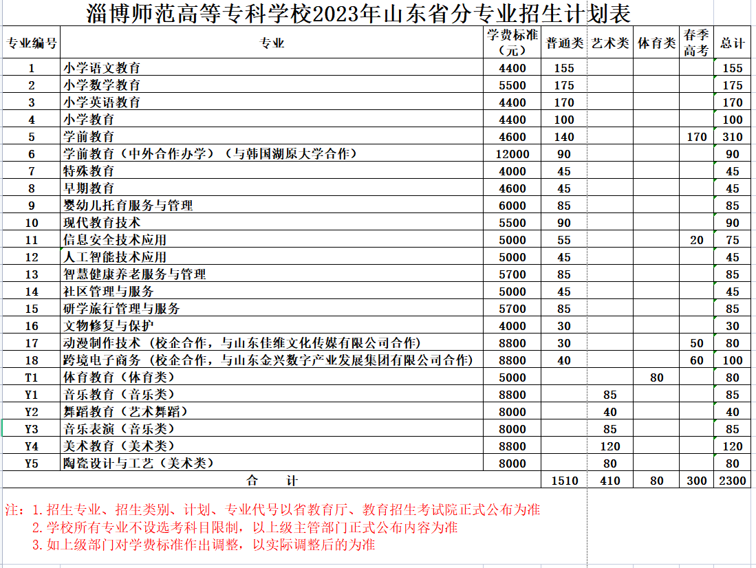 淄博师范高等专科学校2023年山东省分专业招生计划表